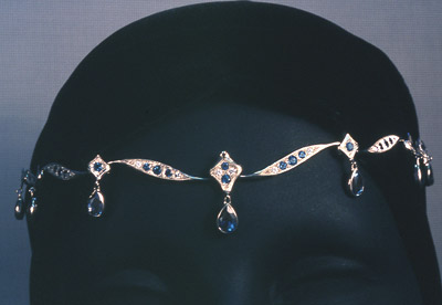 14K palladium white gold, London-blue topaz, and diamonds. "Ferroniers" like this one were popular in medieval times.